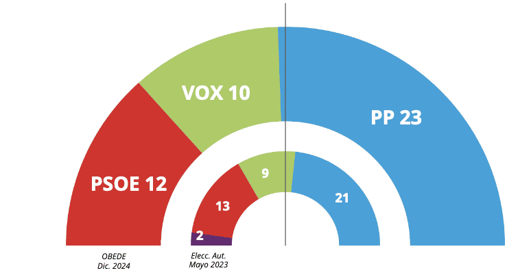 En contraste, el PSOE pierde terreno, situándose en el 23,3% (-2,6 puntos respecto a 2023), lo que se traduce en un diputado menos (12 escaños). La desmovilización de su electorado, con un 40,4% de sus antiguos votantes inclinándose ahora por la abstención, acentúa esta caída. Vox, por su parte, sube ligeramente al 19,6%, logrando un escaño adicional (10 diputados). Sin embargo, las fuerzas a la izquierda del PSOE, como Sumar y Podemos, quedarían fuera del parlamento regional, debido a su fragmentación y falta de cohesión.