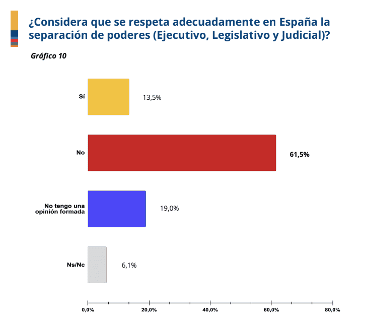 Un dato preocupante del barómetro es la evaluación de la calidad democrática en España: el 52,4% de los encuestados la califica como baja o muy baja, y solo un 16% la valora como alta o muy alta. Además, el 61,5% considera que no se respeta adecuadamente la separación de poderes, una percepción que se extiende incluso entre los votantes de diferentes bloques ideológicos.