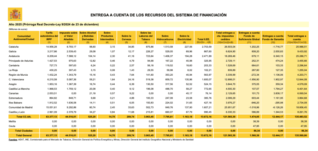 Según el documento publicado en la web del Ministerio de Hacienda, se trata de las entregas a cuenta prorrogadas y afecta a todas las comunidades autónomas, no solo a la Región de Murcia. Es decir, las cantidades no están actualizadas debido a la prórroga de los Presupuestos Generales del Estado. Como resultado, las entregas a cuenta se prorrogan automáticamente, algo que forma parte del procedimiento habitual en estos casos.