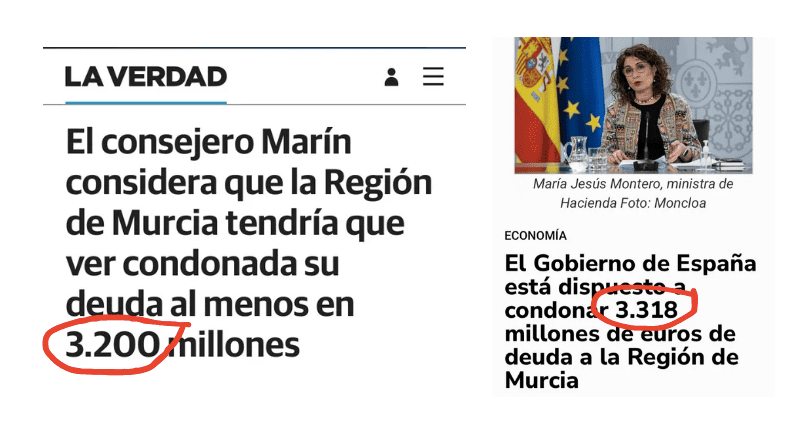 Un dato más: la condonación (3.318 millones) propuesta para la Región de Murcia representa el 4% del total de condonación (83.252 millones) propuesto para las comunidades cuando la Región supone el 2,9% del PIB y el 3,4% de la población.