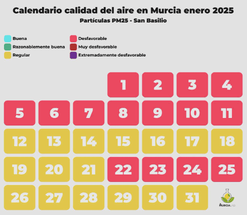 Ni un solo día del mes de enero la calidad del aire en la ciudad de Murcia ha sido razonablemente buena. La mayor parte de los días la calidad del aire ha sido desfavorable.