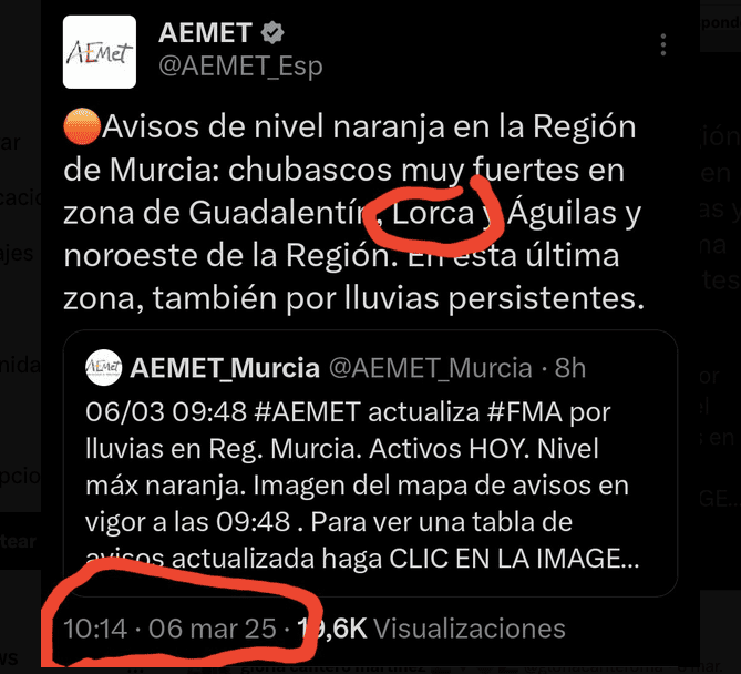 La petición de Ortuño se produce después de que el alcalde de Lorca, Fulgencio Gil, del PP, culpara a la AEMET de haber fallado en sus previsiones del pasado 6 de marzo cuando ésta, en realidad, había activado la alerta naranja con horas de antelación solo que el alcalde de Lorca, al parecer, no se había enterado.
