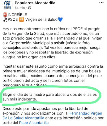 El PP de Alcantarilla defiende la libertad de expresión y explica que se trató de un acto privado de la Hermandad de la Virgen de la Salud que el PSOE de la localidad ha utilizado como «arma arrojadiza» contra la primera mujer alcaldesa de la localidad. «Elegir el día de la madre para atacar a dos de ellas es aún más indecente» publicaron en Facebook en alusión a Paqui Terol y a la Virgen María.