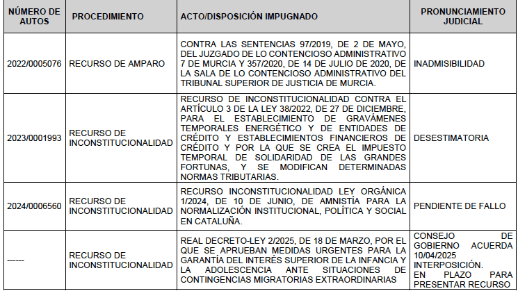 El segundo fue un recurso de inconstitucionalidad interpuesto en 2023 contra el artículo 3 de la Ley 38/2022, de 27 de diciembre, que establecía gravámenes temporales sobre el sector energético, las entidades de crédito y las grandes fortunas, además de modificar varias normas tributarias. El Tribunal Constitucional desestimó este recurso del Gobierno murciano.