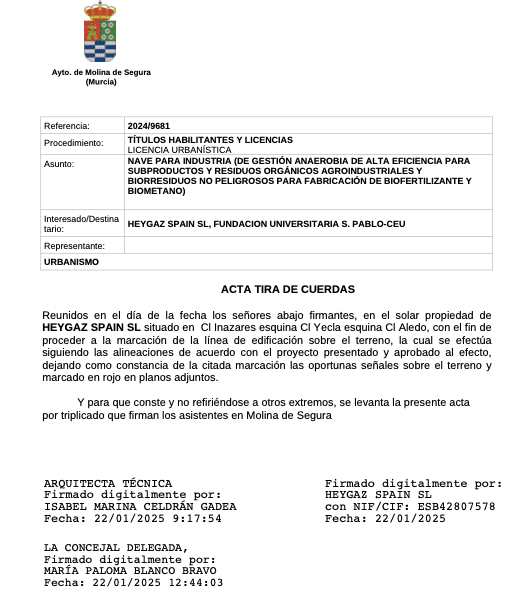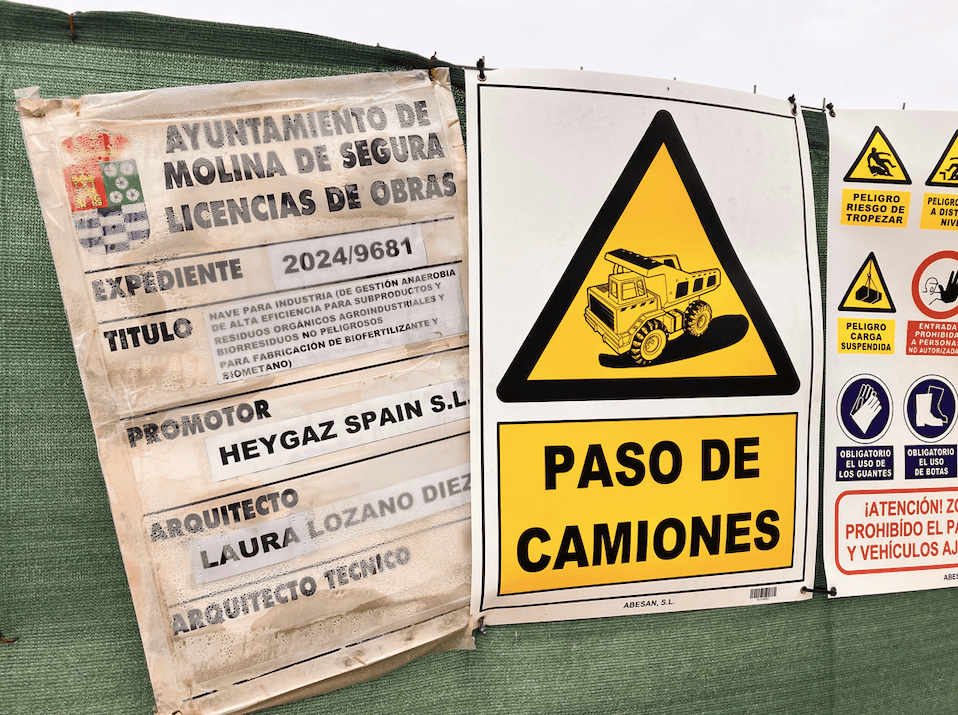 La planta de biogás promovida por HEYGAZ en Molina de Segura se está construyendo sin proyecto de ejecución aprobado y con la licencia urbanística formalmente suspendida. Así lo acreditan los propios informes municipales a los que ha tenido acceso RRNEWS.