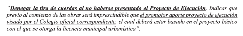 Solo un día antes, el 14/01/ 2025, la Arquitecta Técnica de la Concejalía de Urbanismo emitió un informe denegando la petición de tiras de cuerdas al constatar que la promotora no había presentado el proyecto de ejecución, que debía ajustarse al proyecto básico con el que se otorgó la licencia urbanística el 1 de julio de 2024.
