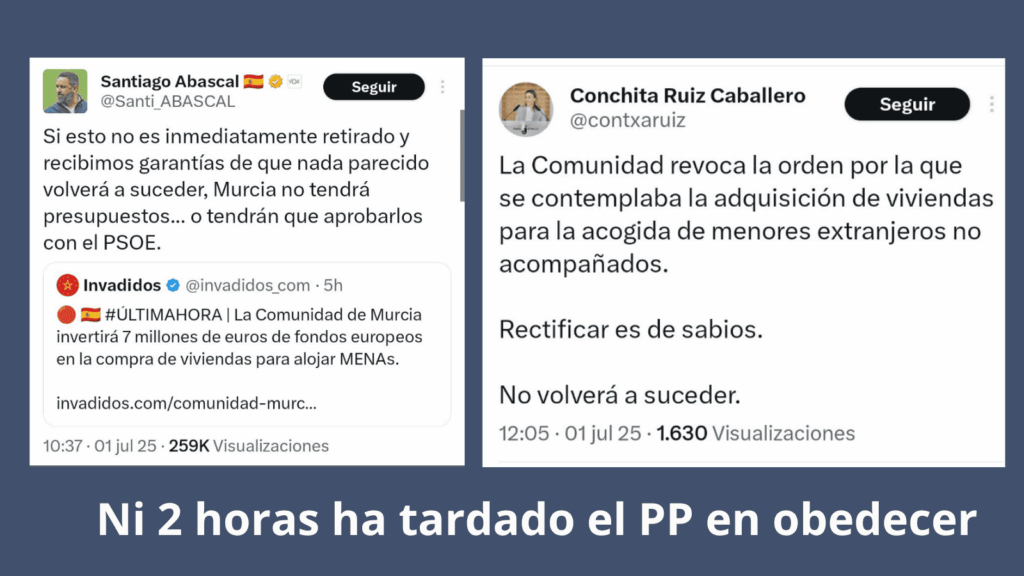 El chantaje ha surtido efecto. Tras la amenaza pública de VOX de votar en contra de los presupuestos de la Región de Murcia si el Partido Popular no revocaba la compra de viviendas para menores extranjeros no acompañados, el Gobierno de López Miras ha claudicado. No ha tardado ni dos horas en obedecer la orden de Santiago Abascal.