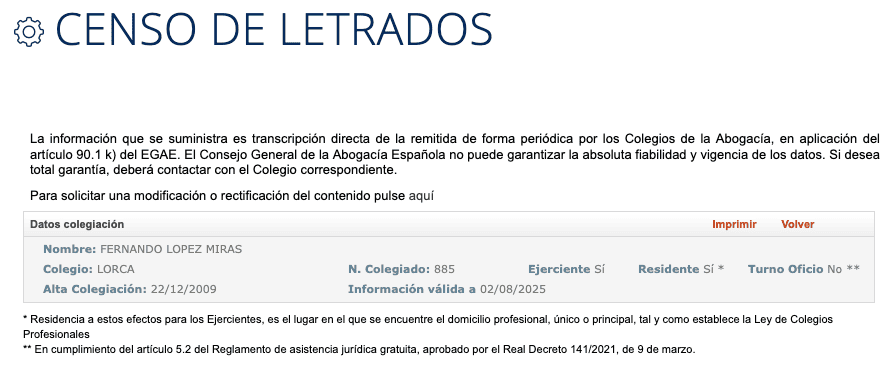 No solo vulnera el Estatuto de la Abogacía (Real Decreto Ley 135/2021), también vulnera la Ley Ley 6/2004, de 28 de diciembre, del Estatuto del Presidente y del Consejo de Gobierno de la Región de Murcia. Si es presidente, no puede mantener como abogado en ejercicio con dirección de despacho situado en Lorca según el censo de la Abogacía. No puede, es ilegal. Tampoco puede aparecer togado en actos públicos. Ese derecho solo está reservado al Rey no siendo ejerciente. Y López Miras, aunque se crea rey, no lo es.