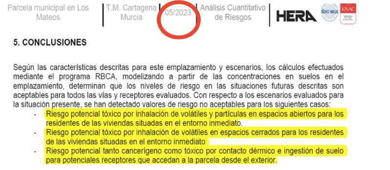 El 15 de marzo de 2023, la Universidad Politécnica de Cartagena entregó un estudio con conclusiones inequívocas: “Los resultados muestran altas concentraciones de metal(oid)es, superando más de 100 veces los Niveles Genéricos de Referencia SE RECOMIENDA EL TRASLADO DE LOS SUELOS CONTAMINADOS, PREVIO TRATAMIENTO, A VERTEDERO DE RESIDUOS PELIGROSOS.”