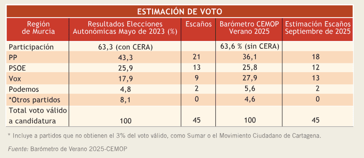 El último Barómetro de Verano del CEMOP ha encendido todas las alarmas en el Partido Popular murciano. Aunque el PP de Fernando López Miras sigue siendo la primera fuerza política en la Región, con un 36,1% de estimación de voto y 18 escaños, la encuesta confirma una sangría: en los últimos dos años, alrededor de 37.000 votantes populares han dado el salto a Vox.