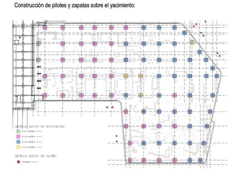 Los planos técnicos incluidos en la documentación muestran una retícula estructural con múltiples apoyos sobre el área arqueológica, así como anclajes de aproximadamente 2,5 metros de lado destinados a fijar los pilares que sostendrán la losa superior.